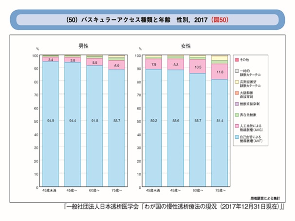 長期にわたる患者さんの安心安定した透析生活、さらには生命に対する危険を考えるとやむを得ない場合を除きできる限り人工血管の使用を控えるといった医師を含む医療スタッフの努力が、徐々に増加している人工血管の使用をかろうじて抑える力になっていることは間違いありません。